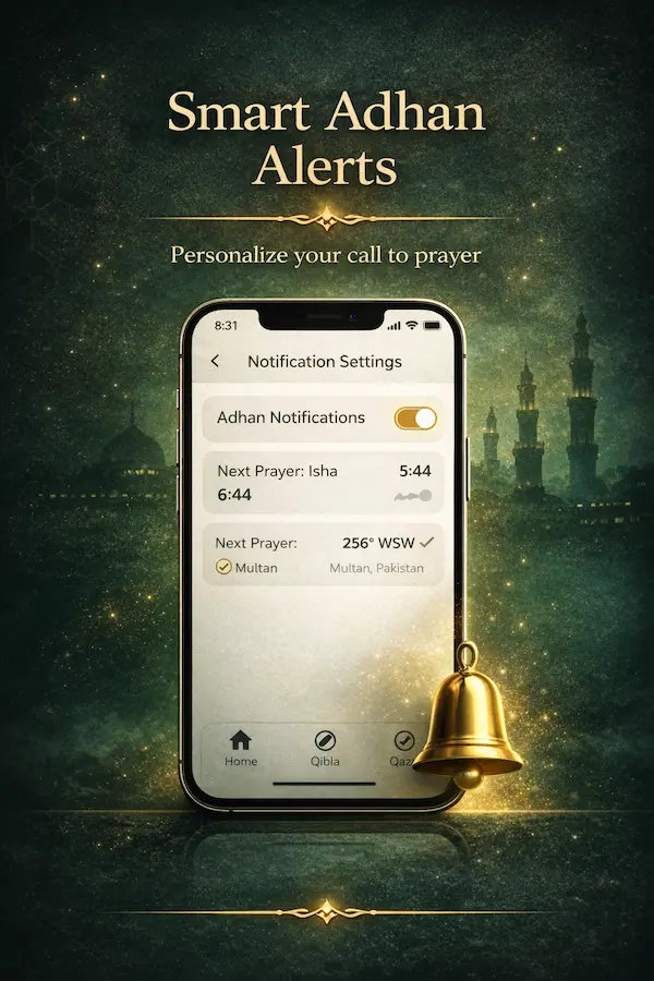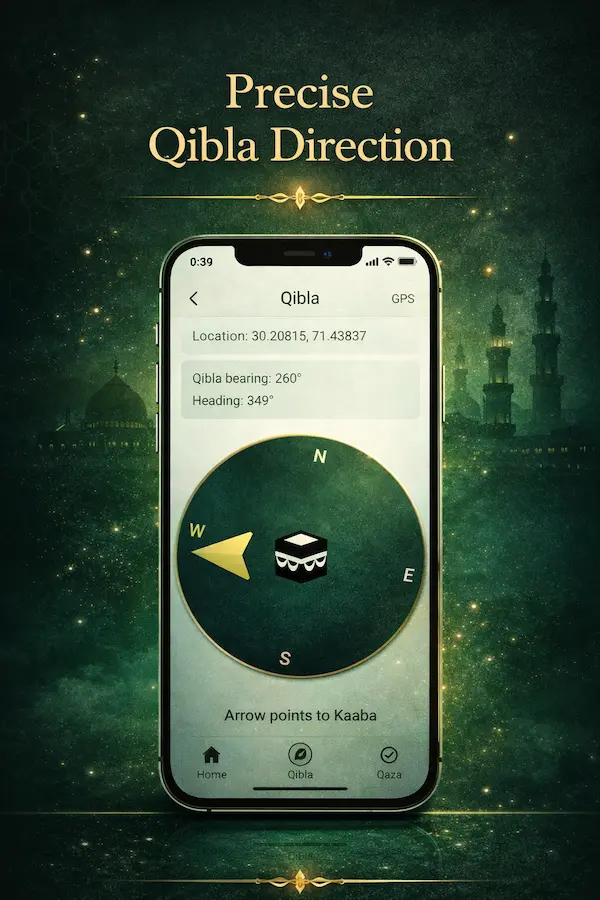 Prayer times, Qibla direction, reminders, and Qaza tracking in one clean Islamic companion app built for everyday consistency.